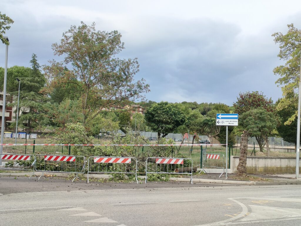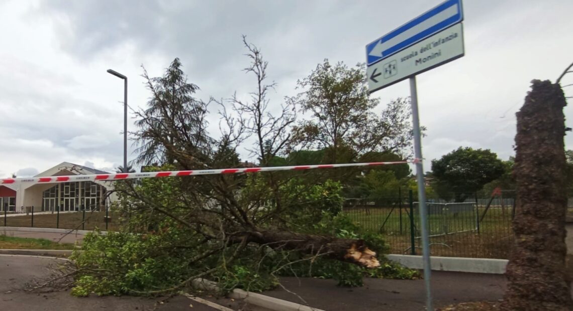 UMBERTIDE – Forti raffiche di vento e pioggia. Nemmeno Umbertide è stata risparmiata dal maltempo che sta colpendo in queste ore l’intero territorio regionale. Nel pomeriggio di giovedì 12 settembre, a causa delle cattive condizioni climatiche, un albero posizionato a pochi passi dal cancello d’ingresso della scuola dell’infanzia “Marcella Monini” è stato letteralmente spezzato in due. Fortunatamente nessuna persona è rimasta coinvolta. Sul posto si è recata la polizia locale che ha messo in sicurezza l’area.