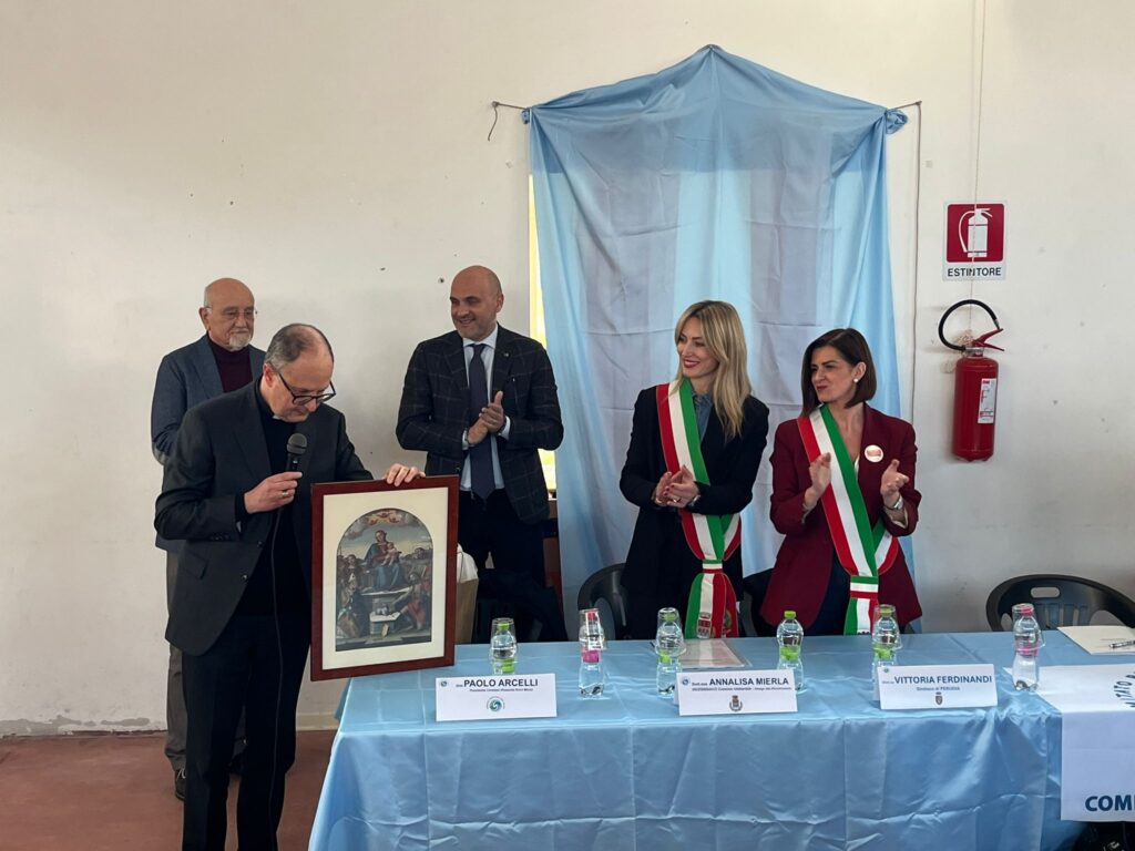 E’ stato poi l’arcivescovo Ivan Maffeis ad impartire la benedizione ai presenti e ad annunciare ufficialmente l’avvio dei lavori per la Chiesa di San Paterniano di Pierantonio, un segnale importante non solo dal punto di vista religioso ma anche per il valore identitario che i luoghi di culto rappresentano per le comunità. Lo stesso arcivescovo ha donato la copia di un quadro degli anni Settanta recuperato in una bancarella di Perugia che è una riproduzione della Pala presente all’interno della Chiesa di Pierantonio, in segno di buon auspicio per la ricostruzione.